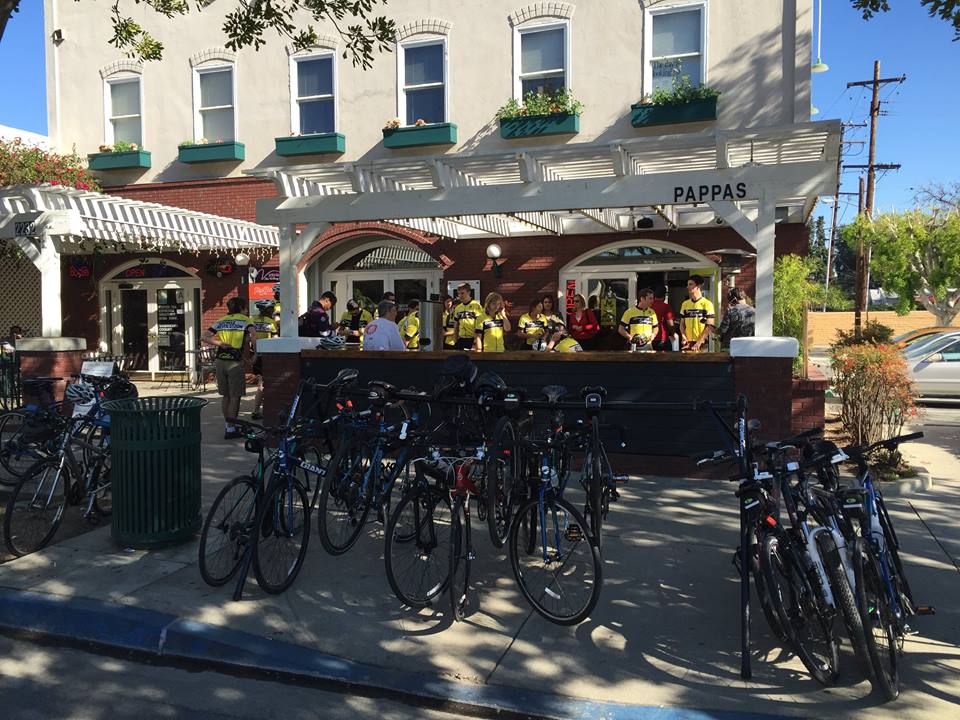 Arriving in La Verne the scene changed. The bike lanes ended and we moved out into the street, ‘taking the lane’. The downtown area was lively, tightly packed with cars and people on their way to local destinations. We pulled off the Bikeway and gathered at our destination, Pappas Artisanal.